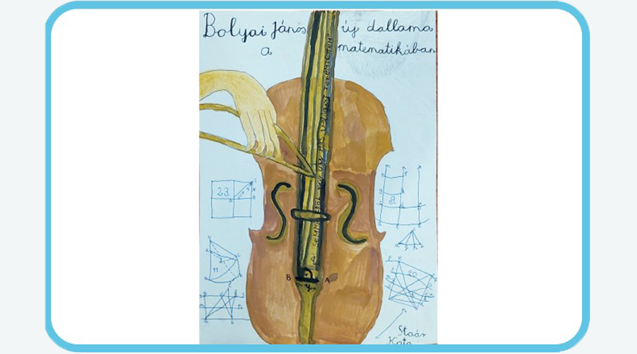 A Bolyai János Matematikai Társulat APP&X matematikai alkotópályázatán 16 diákot és 12 tanárt díjaztak. A díjakat Szilágyi Áron olimpiai bajnok vívó, Kollár László, a Magyar Tudományos Akadémia főtitkára, Pálfy Péter Pál, a Bolyai Társulat elnöke és Laczkovich Miklós, az MTA rendes tagja adta át a budapesti Vasarely Múzeumban. Képünkön Staár Kata, az egyik legfiatalabb díjazott alkotása: Bolyai János új dallama a matematikában. Szász Réka számolt be a pályázat tapasztalatairól és eredményeiről.